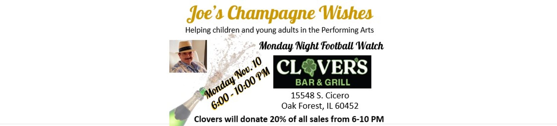 Joe's Champagne Wishes NFP is focused on helping children and young adults expand their talent, experience and love for the performing arts and the visual arts.